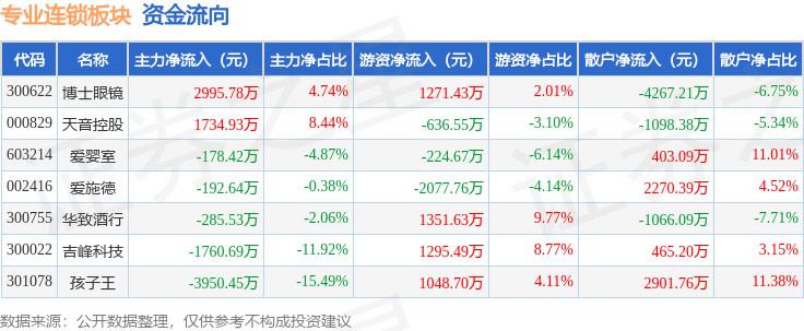从资金流向上来看,当日专业连锁板块主力资金净流出1637.03万元,游资资金净流入2028.27万元,散户资金净流出391.24万元。专业连锁板块个股资金流向见下表: