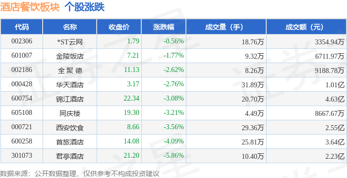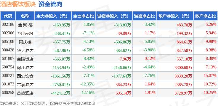 从资金流向上来看,当日酒店餐饮板块主力资金净流出1.2亿元,游资资金净流出4223.19万元,散户资金净流入1.62亿元。酒店餐饮板块个股资金流向见下表: