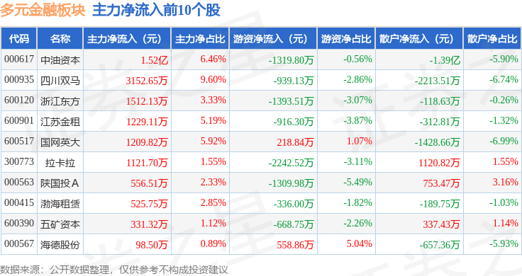 从资金流向上来看,当日多元金融板块主力资金净流入467.44万元,游资资金净流出2256.28万元,散户资金净流入1788.85万元。多元金融板块个股资金流向见下表: