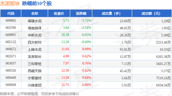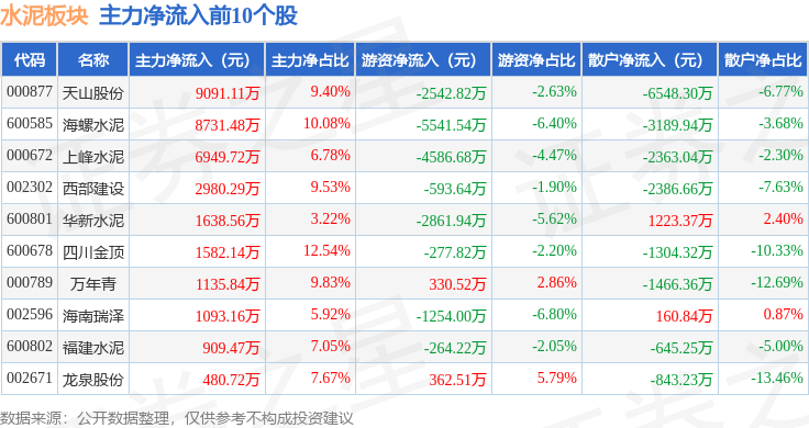 从资金流向上来看,当日水泥板块主力资金净流入2.33亿元,游资资金净流出1.71亿元,散户资金净流出6250.51万元。水泥板块个股资金流向见下表: