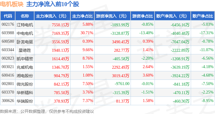 从资金流向上来看,当日电机板块主力资金净流出5618.18万元,游资资金净流入9787.62万元,散户资金净流出4169.44万元。电机板块个股资金流向见下表: