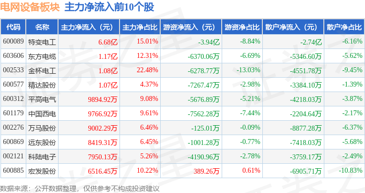 从资金流向上来看,当日电网设备板块主力资金净流入12.77亿元,游资资金净流出6.45亿元,散户资金净流出6.32亿元。电网设备板块个股资金流向见下表: