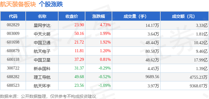 证券之星消息,10月9日航天装备板块较上一交易日上涨1.4%,星网宇达领涨。当日上证指数报收于3933.97,上涨1.32%。深证成指报收于13725.56,上涨1.47%。航天装备板块个股涨跌见下表: