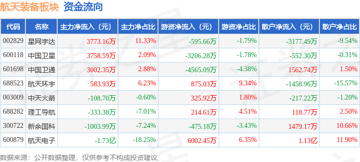 从资金流向上来看,当日航天装备板块主力资金净流出7586.83万元,游资资金净流出1424.2万元,散户资金净流入9011.03万元。航天装备板块个股资金流向见下表: