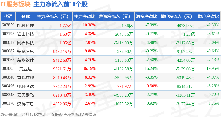 从资金流向上来看,当日IT服务板块主力资金净流出1.15亿元,游资资金净流出1.54亿元,散户资金净流入2.7亿元。IT服务板块个股资金流向见下表: