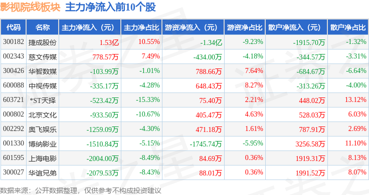 从资金流向上来看,当日影视院线板块主力资金净流出7.34亿元,游资资金净流入1.41亿元,散户资金净流入5.93亿元。影视院线板块个股资金流向见下表: