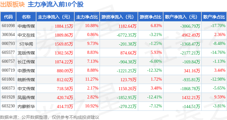 从资金流向上来看,当日出版板块主力资金净流出1254.43万元,游资资金净流出291.6万元,散户资金净流入1546.02万元。出版板块个股资金流向见下表: