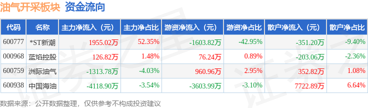 从资金流向上来看,当日油气开采板块主力资金净流出3350.84万元,游资资金净流出4170.61万元,散户资金净流入7521.45万元。油气开采板块个股资金流向见下表: