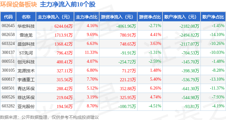从资金流向上来看,当日环保设备板块主力资金净流出1701.97万元,游资资金净流入6832.84万元,散户资金净流出5130.87万元。环保设备板块个股资金流向见下表: