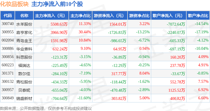 从资金流向上来看,当日化妆品板块主力资金净流入2247.14万元,游资资金净流出3434.83万元,散户资金净流入1187.69万元。化妆品板块个股资金流向见下表: