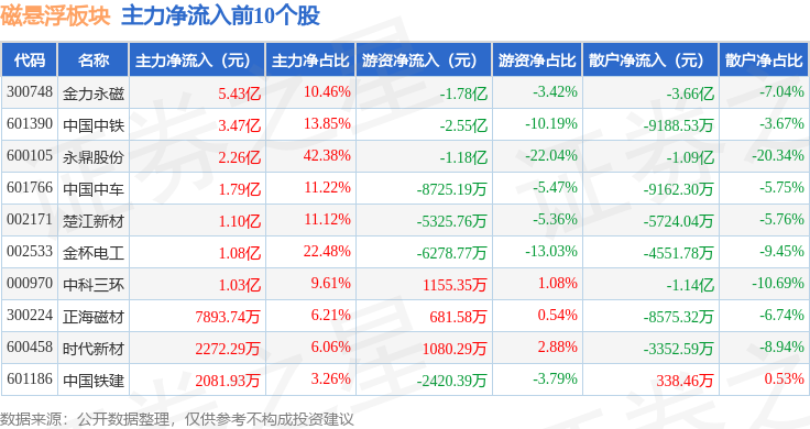 从资金流向上来看,当日磁悬浮板块主力资金净流入11.95亿元,游资资金净流出6.44亿元,散户资金净流出5.51亿元。磁悬浮板块个股资金流向见下表: