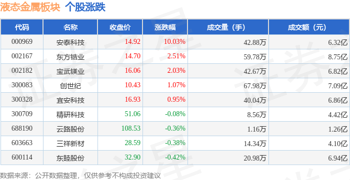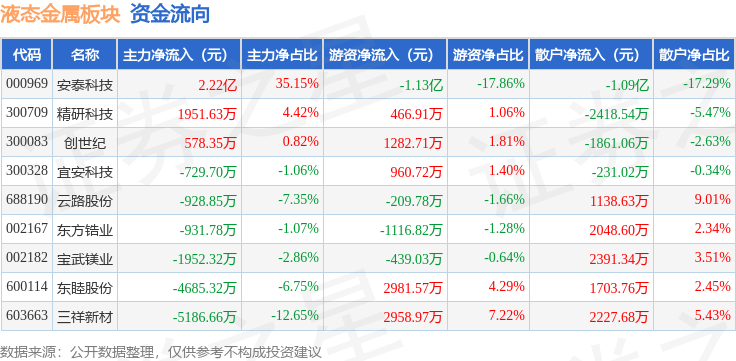 从资金流向上来看,当日液态金属板块主力资金净流入1.03亿元,游资资金净流出4404.37万元,散户资金净流出5933.73万元。液态金属板块个股资金流向见下表: