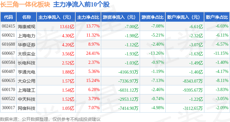 从资金流向上来看,当日长三角一体化板块主力资金净流出15.07亿元,游资资金净流入4.8亿元,散户资金净流入10.27亿元。长三角一体化板块个股资金流向见下表: