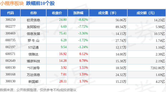 证券之星消息,10月9日小程序板块较上一交易日上涨1.14%,利欧股份领涨。当日上证指数报收于3933.97,上涨1.32%。深证成指报收于13725.56,上涨1.47%。小程序板块个股涨跌见下表: