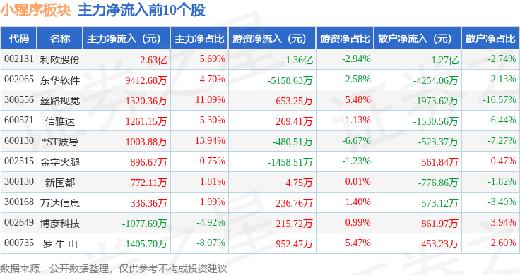 从资金流向上来看,当日小程序板块主力资金净流入1.57亿元,游资资金净流出1.44亿元,散户资金净流出1312.42万元。小程序板块个股资金流向见下表: