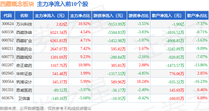 从资金流向上来看,当日西藏概念板块主力资金净流入2.19亿元,游资资金净流出1.09亿元,散户资金净流出1.11亿元。西藏概念板块个股资金流向见下表: