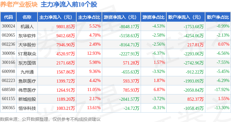 从资金流向上来看,当日养老产业板块主力资金净流出5.97亿元,游资资金净流入743.89万元,散户资金净流入5.89亿元。养老产业板块个股资金流向见下表: