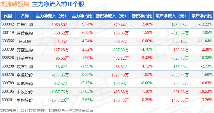 从资金流向上来看,当日禽流感板块主力资金净流出4025.66万元,游资资金净流入4423.58万元,散户资金净流出397.92万元。禽流感板块个股资金流向见下表: