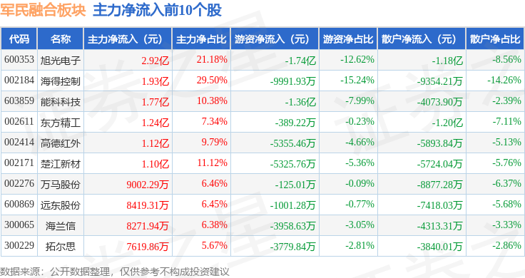 从资金流向上来看,当日军民融合板块主力资金净流出1.38亿元,游资资金净流出1.64亿元,散户资金净流入3.02亿元。军民融合板块个股资金流向见下表: