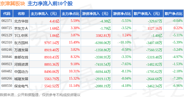 从资金流向上来看,当日京津冀板块主力资金净流入2.04亿元,游资资金净流出7.93亿元,散户资金净流入5.89亿元。京津冀板块个股资金流向见下表: