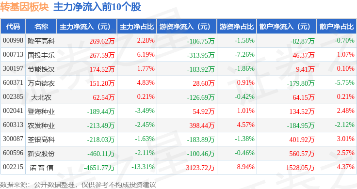 从资金流向上来看,当日转基因板块主力资金净流出1.28亿元,游资资金净流入4217.07万元,散户资金净流入8624.62万元。转基因板块个股资金流向见下表: