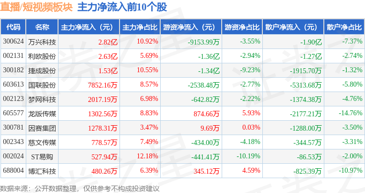从资金流向上来看,当日直播/短视频板块主力资金净流出2.51亿元,游资资金净流出1.43亿元,散户资金净流入3.94亿元。直播/短视频板块个股资金流向见下表: