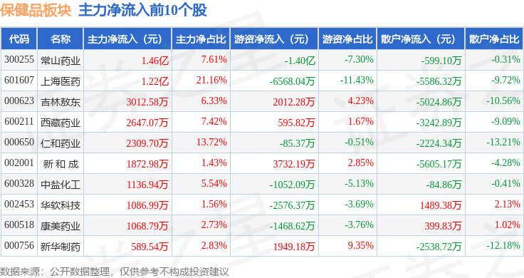 从资金流向上来看,当日保健品板块主力资金净流出9145.16万元,游资资金净流入8231.75万元,散户资金净流入913.41万元。保健品板块个股资金流向见下表: