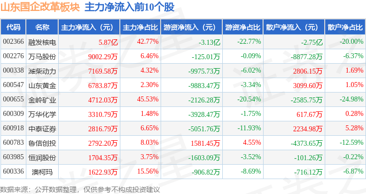 从资金流向上来看,当日山东国企改革板块主力资金净流入2649.14万元,游资资金净流出3.24亿元,散户资金净流入2.98亿元。山东国企改革板块个股资金流向见下表: