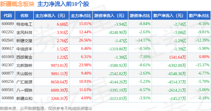 从资金流向上来看,当日新疆概念板块主力资金净流入14.94亿元,游资资金净流出7.46亿元,散户资金净流出7.49亿元。新疆概念板块个股资金流向见下表:
