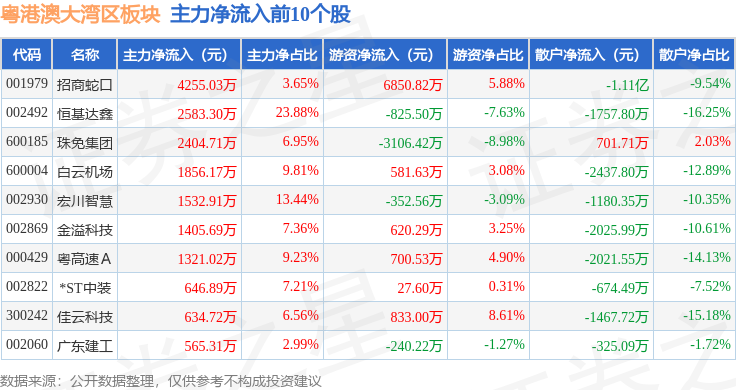 从资金流向上来看,当日粤港澳大湾区板块主力资金净流出10.73亿元,游资资金净流入4.28亿元,散户资金净流入6.45亿元。粤港澳大湾区板块个股资金流向见下表: