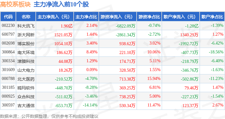 从资金流向上来看,当日高校系板块主力资金净流出10.61亿元,游资资金净流入5.31亿元,散户资金净流入5.3亿元。高校系板块个股资金流向见下表: