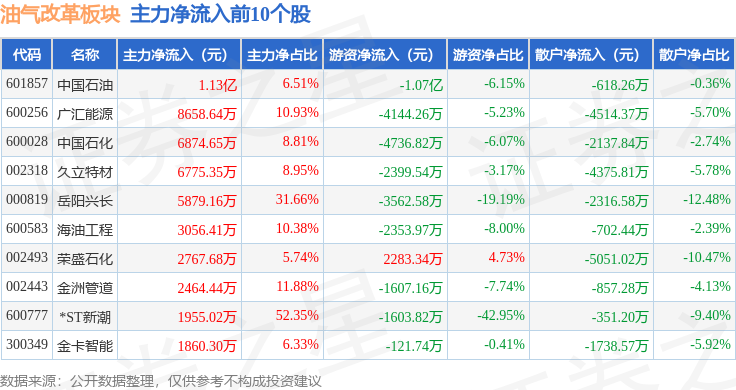 从资金流向上来看,当日油气改革板块主力资金净流入2.87亿元,游资资金净流出2.51亿元,散户资金净流出3579.97万元。油气改革板块个股资金流向见下表: