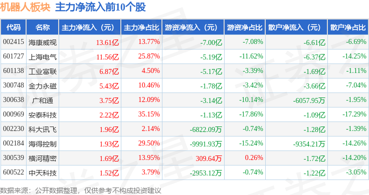 从资金流向上来看,当日机器人板块主力资金净流出11.5亿元,游资资金净流入7.36亿元,散户资金净流入4.15亿元。机器人板块个股资金流向见下表: