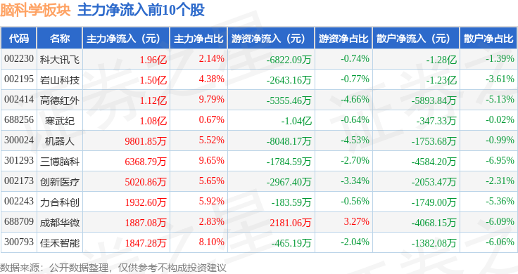 从资金流向上来看,当日脑科学板块主力资金净流入2.29亿元,游资资金净流出7461.03万元,散户资金净流出1.54亿元。脑科学板块个股资金流向见下表: