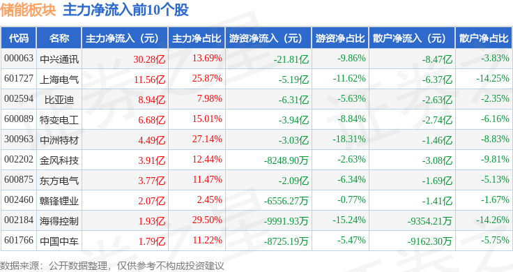 从资金流向上来看,当日储能板块主力资金净流入13.61亿元,游资资金净流出24.2亿元,散户资金净流入10.59亿元。储能板块个股资金流向见下表: