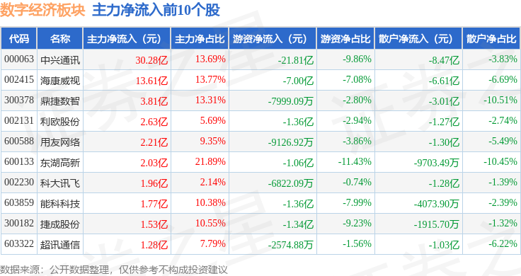 从资金流向上来看,当日数字经济板块主力资金净流入3.09亿元,游资资金净流出18.01亿元,散户资金净流入14.93亿元。数字经济板块个股资金流向见下表: