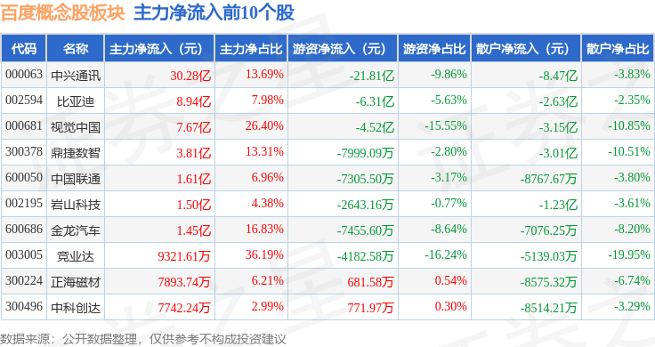 从资金流向上来看,当日百度概念股板块主力资金净流入14.96亿元,游资资金净流出17.21亿元,散户资金净流入2.25亿元。百度概念股板块个股资金流向见下表: