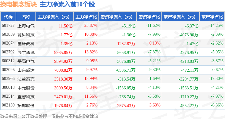 从资金流向上来看,当日换电概念板块主力资金净流入5.94亿元,游资资金净流出5.55亿元,散户资金净流出3967.71万元。换电概念板块个股资金流向见下表: