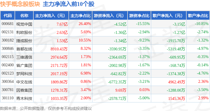 从资金流向上来看,当日快手概念股板块主力资金净流入3.8亿元,游资资金净流出6.18亿元,散户资金净流入2.39亿元。快手概念股板块个股资金流向见下表: