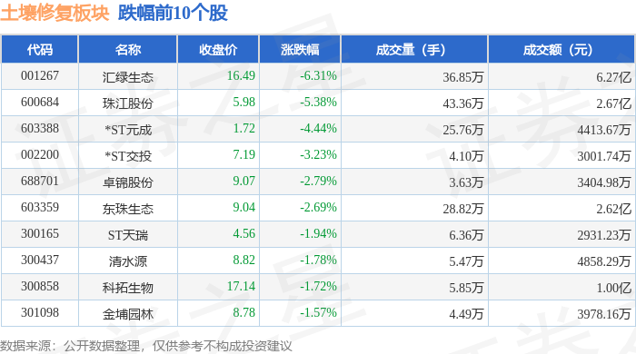 证券之星消息,10月9日土壤修复板块较上一交易日上涨1.55%,冠中生态领涨。当日上证指数报收于3933.97,上涨1.32%。深证成指报收于13725.56,上涨1.47%。土壤修复板块个股涨跌见下表: