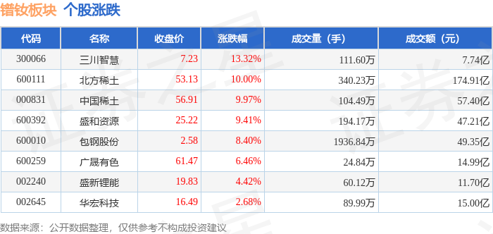 证券之星消息,10月9日镨钕板块较上一交易日上涨9.12%,三川智慧领涨。当日上证指数报收于3933.97,上涨1.32%。深证成指报收于13725.56,上涨1.47%。镨钕板块个股涨跌见下表: