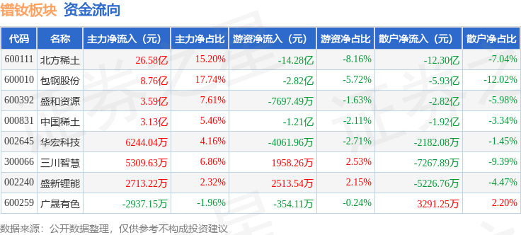 从资金流向上来看,当日镨钕板块主力资金净流入43.2亿元,游资资金净流出19.08亿元,散户资金净流出24.12亿元。镨钕板块个股资金流向见下表: