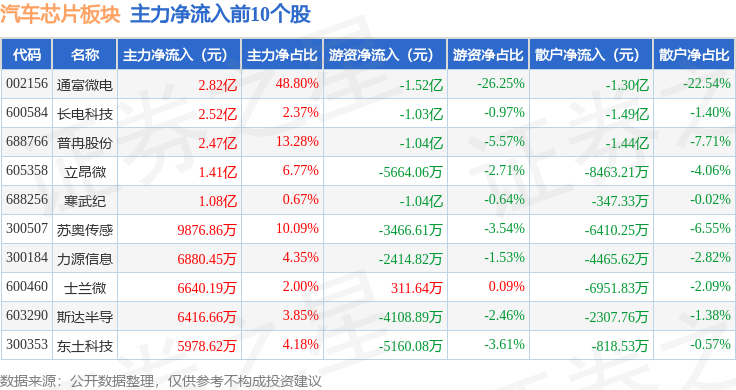 从资金流向上来看,当日汽车芯片板块主力资金净流出7.77亿元,游资资金净流入3.16亿元,散户资金净流入4.62亿元。汽车芯片板块个股资金流向见下表: