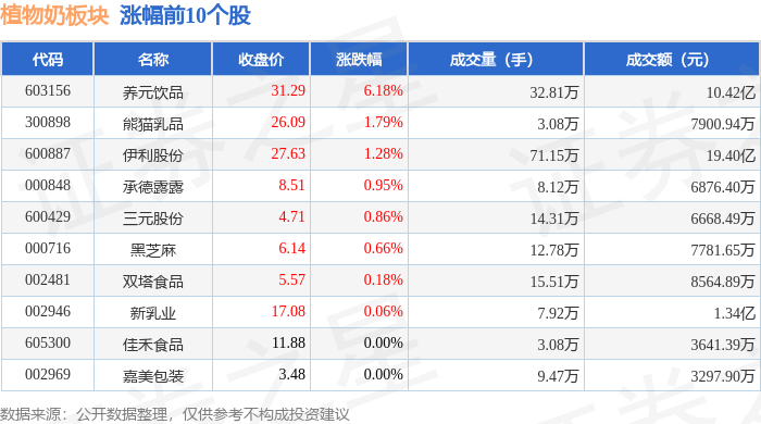 证券之星消息,10月9日植物奶板块较上一交易日上涨1.38%,养元饮品领涨。当日上证指数报收于3933.97,上涨1.32%。深证成指报收于13725.56,上涨1.47%。植物奶板块个股涨跌见下表: