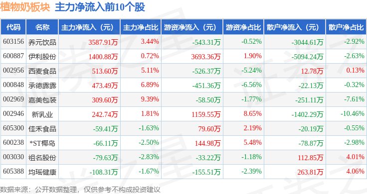 从资金流向上来看,当日植物奶板块主力资金净流出16.91万元,游资资金净流入4397.44万元,散户资金净流出4380.53万元。植物奶板块个股资金流向见下表: