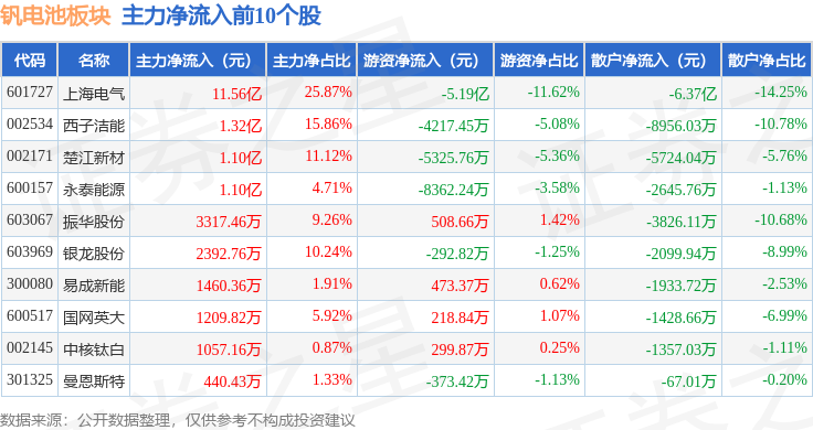 从资金流向上来看,当日钒电池板块主力资金净流入14.57亿元,游资资金净流出6.86亿元,散户资金净流出7.71亿元。钒电池板块个股资金流向见下表: