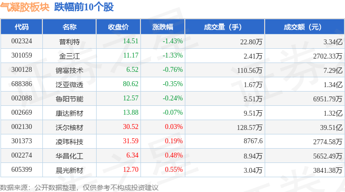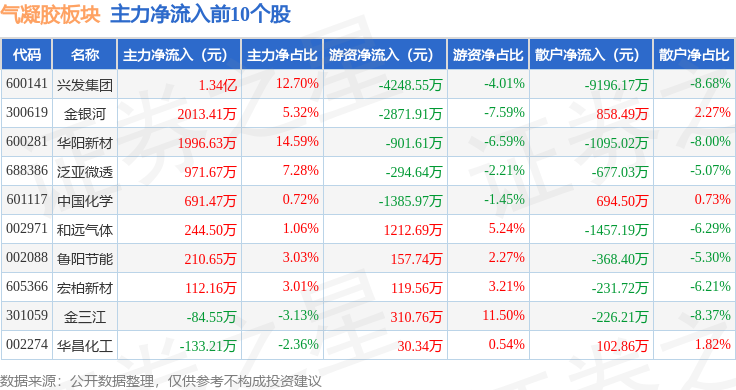 从资金流向上来看,当日气凝胶板块主力资金净流出1.46亿元,游资资金净流入1.12亿元,散户资金净流入3465.55万元。气凝胶板块个股资金流向见下表: