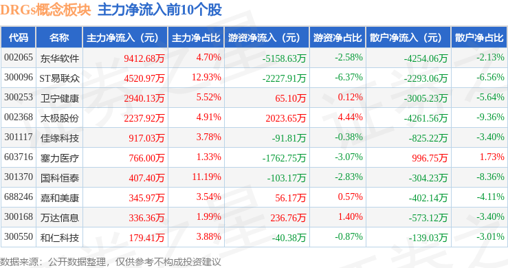 从资金流向上来看,当日DRGs概念板块主力资金净流出2566.07万元,游资资金净流出1910.19万元,散户资金净流入4476.26万元。DRGs概念板块个股资金流向见下表: