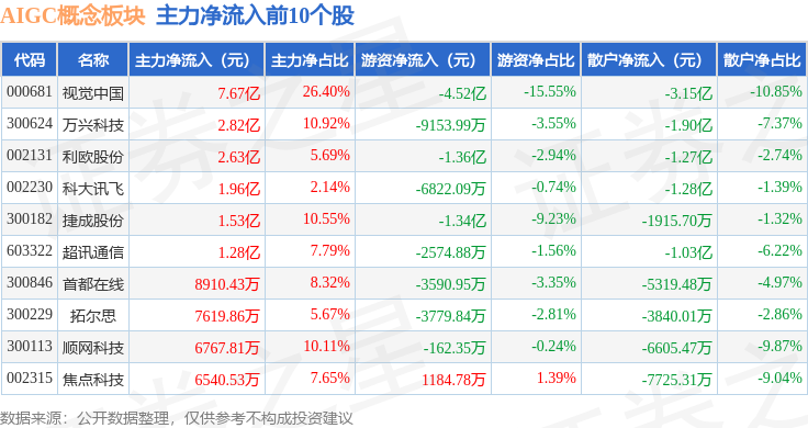 从资金流向上来看,当日AIGC概念板块主力资金净流出10.3亿元,游资资金净流入7209.65万元,散户资金净流入9.58亿元。AIGC概念板块个股资金流向见下表: