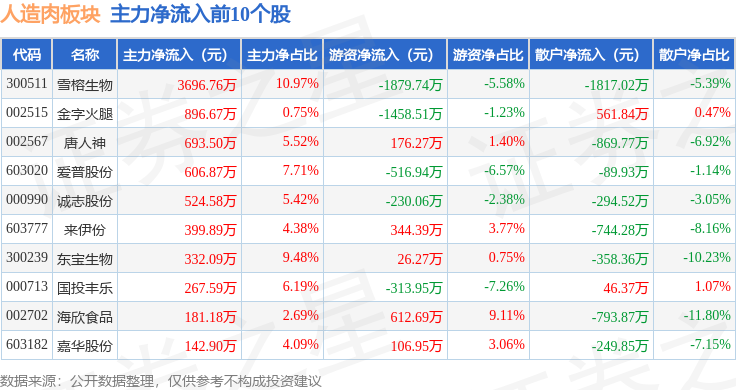 从资金流向上来看,当日人造肉板块主力资金净流出1.86亿元,游资资金净流出1880.2万元,散户资金净流入2.04亿元。人造肉板块个股资金流向见下表: